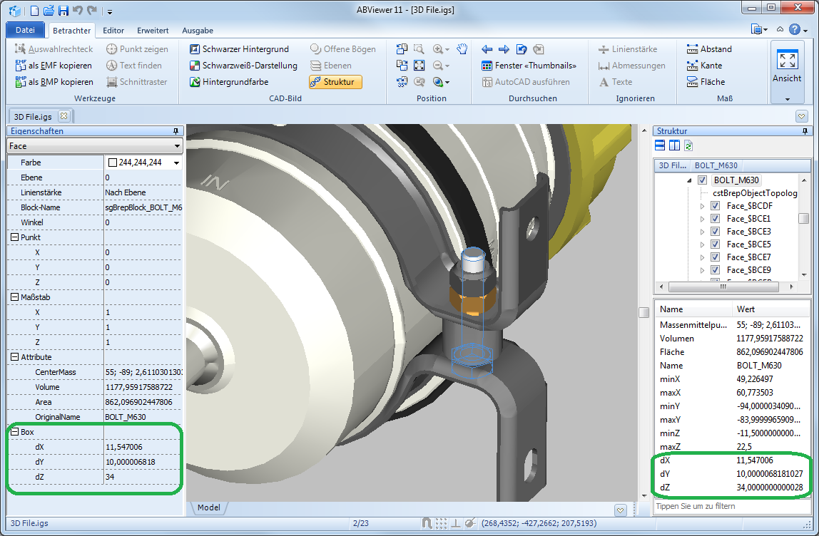 Die Sektion Eigenschaften zeigt die Hauptabmessungen sowohl für die Oberfläche des Teils wie auch für die Gruppe, in welcher er sich befindet, an. Um die Hauptabmessungen des Teils zu erhalten, wählen Sie einen Teil oder eine Gruppe der Elemente im Objektbaum oder auf der Zeichnung. Abmessungen des gewählten Teils werden im Unterteil des Panels Struktur angezeigt und man kann sie im Panel Eigenschaften in der Sektion Box auch finden.