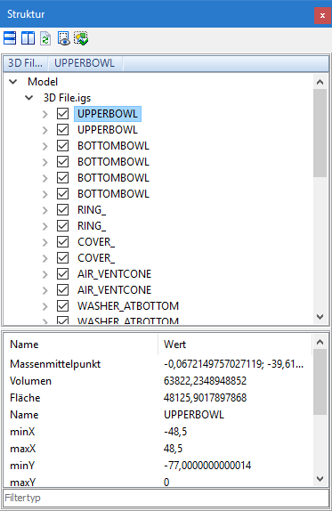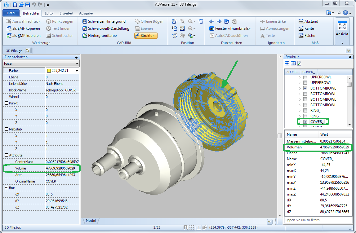 Diese Sektion zeigt die Eigenschaften des gewählten Objektes in der Sektion Struktur: Volumen, Fläche, Massenmittelpunkt usw. Diese Parameter sind im Panel Eigenschaften auch angezeigt.