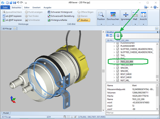 Sie können die Objekte für die Durchsicht direkt im Baum der Objekte wählen oder klicken Sie mit der linken Maustaste in der Zeichnung. Um nur ein Objekt oder eine Objektgruppe im Arbeitsbereich der Zeichnung anzuzeigen, wählen Sie das entsprechende Element in der Baumstruktur und klicken Sie auf Ausgewählte anzeigen