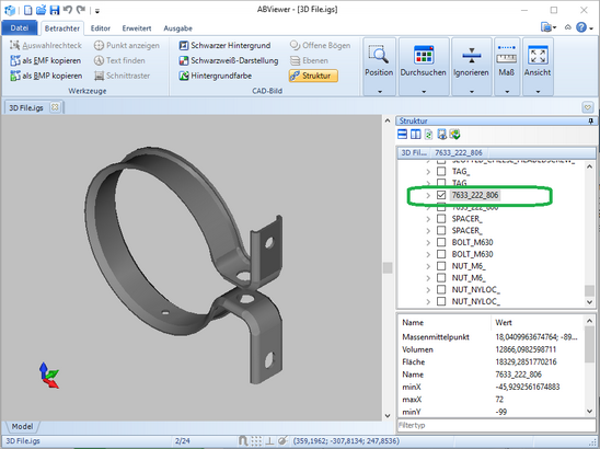 Um die Objekteigenschaften anzuzeigen, wählen Sie dieses Objekt in der Modellstruktur oder klicken Sie auf dieses Element in der Zeichnung mit der linken Maustaste.