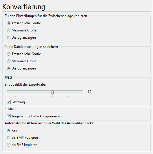 Die Registerkarte enthält die Einstellungen, die die Aktion bei der Speicherung in die Datei und bei dem Kopieren in die Zwischenablage. Die Einstellungen beeinflussen die Konvertierung und Speicherung nur in die Raster-Formate.