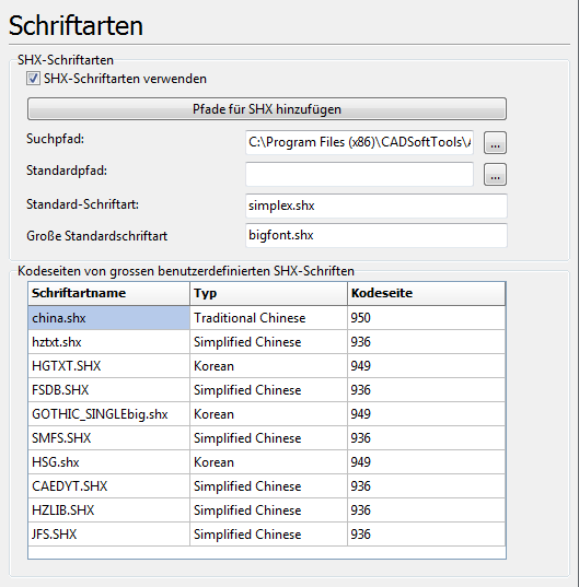 Die Registerkarte enthält Einstellungen, die SHX-Schriftarten in der Zeichnungen zu benutzen erlauben. Die Suchpfade werden eingegeben.