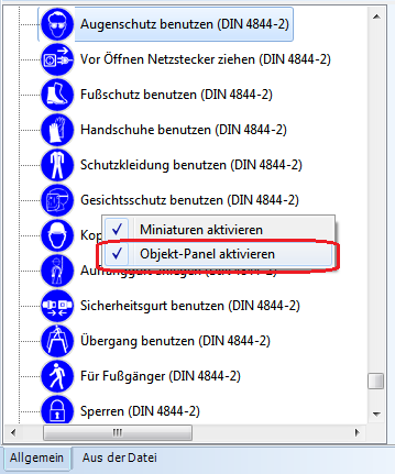 Die Vorlagen der Gruppe Objekte werden standardmäßig im unteren Teil der Palette Bauvorlagen separat angezeigt. Um diese auszublenden, klicken Sie im Anzeigebereich für Vorlagen der Gruppe Objekte mit rechter Maustaste und entfernen Sie das Häkchen neben "Objekt-Panel aktivieren" im angezeigten Kontextmenü: