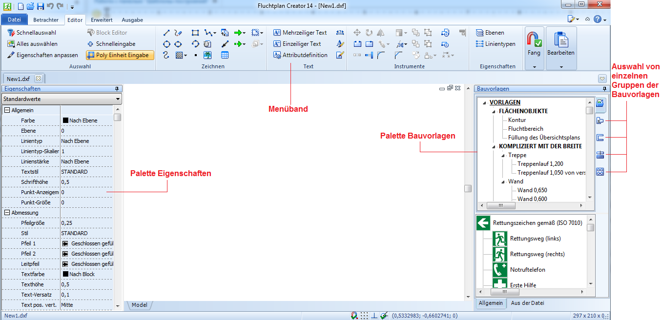 Die Palette Bauvorlagen befindet sich standardmäßig auf der rechter Seite der Software-Oberfläche und ermöglicht einen Zugriff auf Vorlagenobjekte.