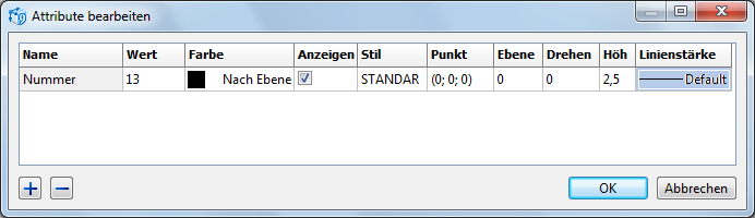 Anzeigen bestimmt, ob das Attribut sichtbar auf der Zeichnung ist. Wenn diese Option nicht abgehackt wird, wird das Attribut nicht dargestellt aber es wird bei der Abfassung benutzt.
