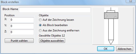 um die nötigen Objekte auf der Zeichnung zu zeigen. Die Wahl mehrerer Objekten ist mit Schnelleingabe möglich. Die Auswahl wird mit der Taste Eingabe bestätigt. Danach erscheint das Fenster Block erstellen. Im Vorschau-Feld des Dialogfensters werden die gewählten Elemente dargestellt. Man kann auch die nötigen Objekte vor der Öffnung des Dialogfensters Block erstellen wählen. Die Anzahl der Objekte, die der Block enthält wird im Feld Gewählte Objekte gezeigt.