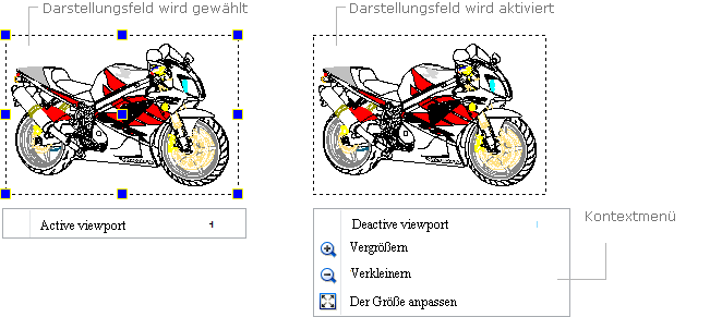 Um ein Darstellungsfeld zu aktivieren, doppelklicken Sie mit der linken Maustaste innerhalb der Umgrenzungen des Darstellungfelds oder wählen Sie das Darstellungsfeld und erfüllen Sie den Befehl Active viewport. Nach der Aktivation werden die Griffe des Darstellungsfelds verschwinden und die Umgrenzungen werden mit einer Strichlinie gezeigt.