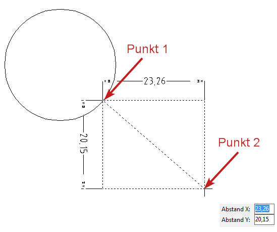 Versatzkoordinaten des Endpunktes (Punkt 2) werden auf dem Basis von den eingegebenen Werten berechnet.