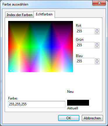 Auf der Registerkarte Echtfarben wird das ganze Spektrum der Farben gezeigt, das bei der Mischung von drei Primarfarben des RGB-Modells - rot, blau und grün - erhaltet wird. Die Farben-Palette RBG enthält mehr als 16 Mill. Farben. Die Farbe wird mit Hilfe der Maus gewählt oder sein Wert wird mit Hilfe der Tastatur ins entsprechende Feld eingegeben. Es ist möglich, die Nummer der Farbe mit der Tastatur ins Feld Farbe einzugeben. Das Komma dient als Begrenzungssymbol.