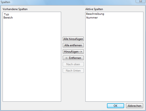 •Aktive Spalten sind eine Liste der Spalten, die in der Tabelle des Dialogfensters Attributbericht gezeigt werden sollen. Mann kann die Reihenfolge der Spalten ändern. Die Spalte Beschreibung kann entfernt nicht werden, sie enthält den Namen des Blocks.
