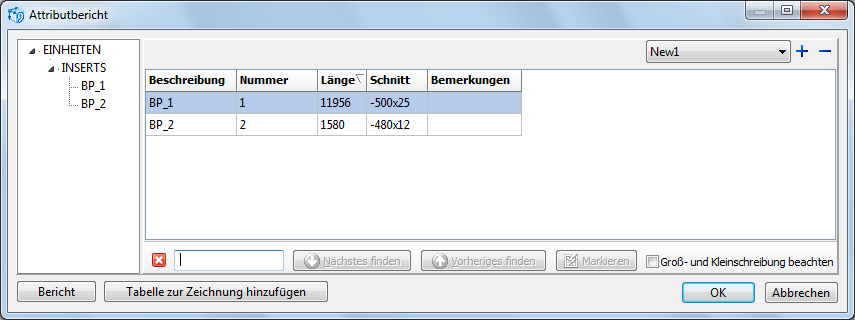 Der Befehl Attributbericht [Erweitert > Attributbericht] ruft das gleichnamige Dialogfenster hervor. Im klassischen Menü befindet sich dieser Befehl unter Instrumente > Attributbericht. Dieses Dialogfenster enthält eine Liste der Blöcke der Zeichnung und zeigt die Werte ihrer Attribute. Eine Tabelle wird aus diesen gebildet, damit man sie in eine externe Datei exportieren oder in die aktive Zeichnung hinzufügen kann. Diese Möglichkeit ist bei der Erstellung der Stücklisten bequem.
