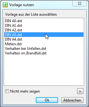 Man kann die Verwendung von Dateivorlagen auf der Registerkarte Allgemein des Dialogfensters "Einstellungen" anpassen. Um die Verwendung von Vorlagen deaktivieren muss man das Häkchen neben der Option Vorlage nutzen entfernen. Die neuen Dateien werden dadurch mit standardmäßigen Parametern erstellt. Wenn die Optionen Vorlage nutzen und Menü der Vorlagen immer anzeigen aktiviert werden, wird das Dialogfenster Vorlage nutzen für die Auswahl von Vorlagen bei Erstellung einer neuen Datei immer angezeigt. In Dialogfenster Vorlage nutzen werden die Dateien mit der Dateierweiterung DXT geladen, diese Dateien befinden sich standardmäßig im Verzeichnis C:\Users\benutzername\Documents\Fluchtplan Creator 14\Templates. Es gibt mehrere Vorlagen für verschiedene Papierformate im Programm Fluchtplan Creator. Man kann auch seine eigenen Dateivorlagen erstellen und für die neuen Zeichnungen verwenden.