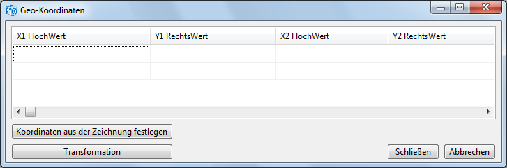1.Durch die Wahl des Befehls Koordinaten aus der Zeichnung festlegen.Dieser Befehl erlaubt den nötigen Punkt auf der Zeichnung durch einen Klick zu wählen, die Spalten X1 HochWert und Y1 RechtsWert werden automatisch ausgefüllt.