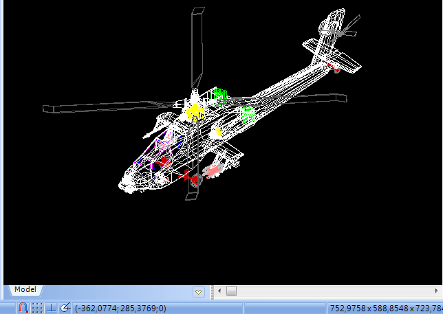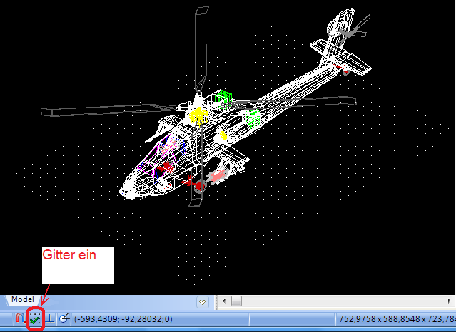 Der Schritt des Gitters wird im Fenster Einstellungen unter der Registerkarte Gitter festgelegt. Als Voreinstellung wird der Schritt automatisch ausgerechnet und ist ein hundertstel seiner größten Seite gleich. Die Abmessungen der Zeichnung werden in der richten unteren Ecke im Format X;Y;Z gezeigt.