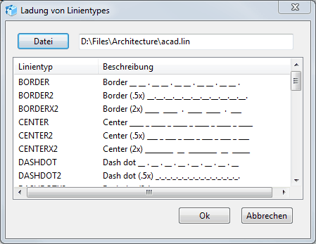 Liste von Linientypen. Liste der Namen von den Linientypen und ihrer Beschreibungen aus der gewählten *.lin-Datei. Die Linientypen, dessen Beschreibung die Formen hat, werden nicht dargestellt.