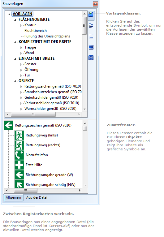 Beim ersten Programmstart werden die Vorlagen aus der Datei Classes.dxf geladen; diese Datei wird mit dem Installationspaket geliefert und im Ordner c:\Users\softgold\Documents\Fluchtplan Creator 14\Templates\..... nach der Installation platziert. Wir empfehlen, diese Datei nicht zu entfernen. Man kann die Liste der Vorlagen in dieser Datei ändern oder seine eigene Vorlagendatei erstellen, um diese auf anderen Rechnern zu verwenden. Man kann die Vorlagen im Modus Vorlagen-Editor bearbeiten.