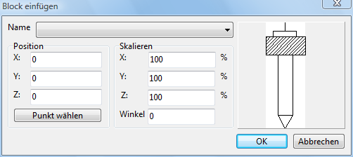 Name - hier können Sie den Namen des zu einfügenden Blocks aus dem Pull-down-Menü wählen. Die Liste enthält die Namen aller Blockdefinitionen in der aktuellen Zeichnung. Falls die Liste leer ist, gibt es keine Blockdefinition.