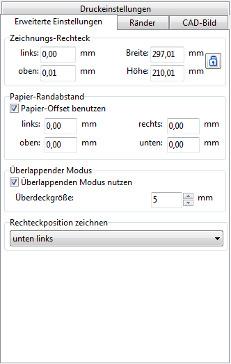 Diese Option ist beim Druck einer großen Zeichnung auf mehreren Blättern brauchbar. Sie legt die Größe des Randes fest, der beim Zusammenkleben der Blätter abgeschnitten wird.