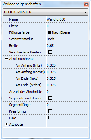 Das Fenster Vorlageneigenschaften enthält die Liste von Eigenschaften und Attributen der ausgewählten Bauvorlage und ermöglicht die Bearbeitung dieser Eigenschaften und Attribute. Das Fenster Vorlageneigenschaften ist eine Floating Palette, die im Modus Vorlagen-Editor verfügbar ist. Das Fenster sieht für die Vorlage Wand z.B. folgendermaßen aus:
